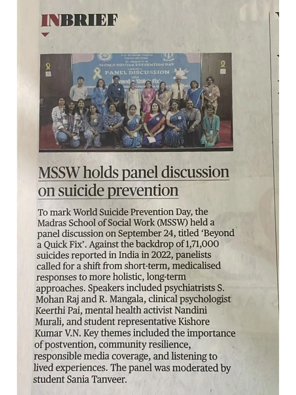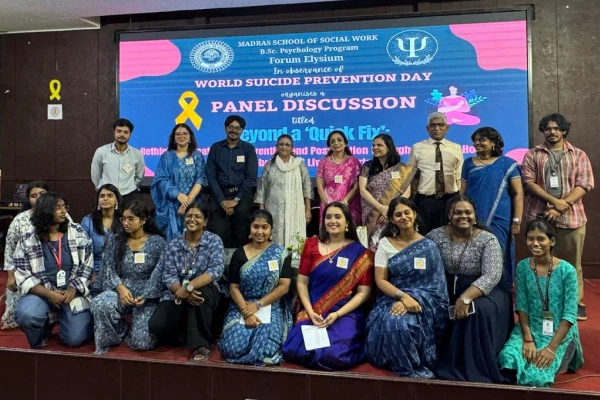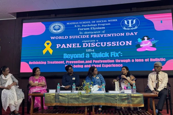 Dr. Keerthi Pai was invited as a panelist by Madras School of Social Work College, for a discussion on “Beyond a Quick Fix: Rethinking Treatment, Prevention and Postvention through a Lens of Holistic Well-being and Lived Experience”.