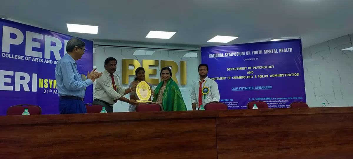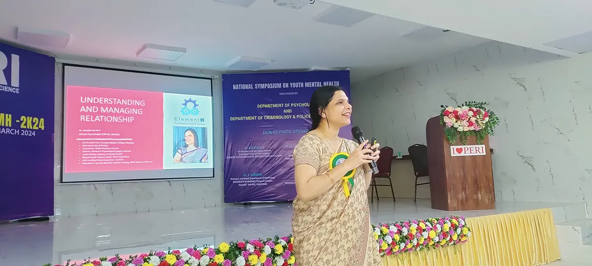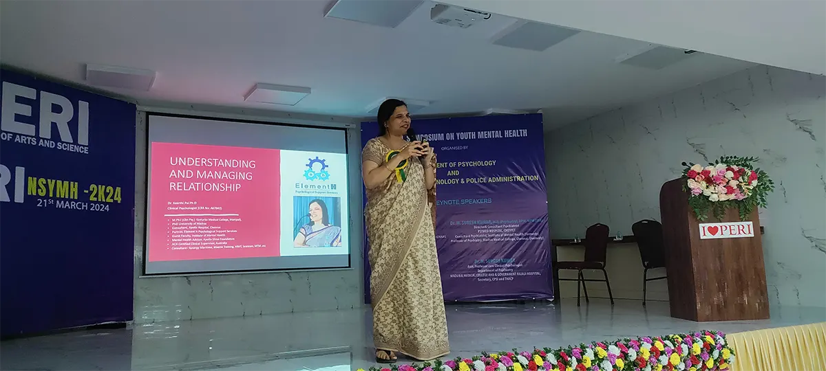 Dr. Keerthi Pai was invited as a keynote speaker for the Youth Mental Health National Symposium organised by the Department of Psychology, Peri College of Arts and Science.